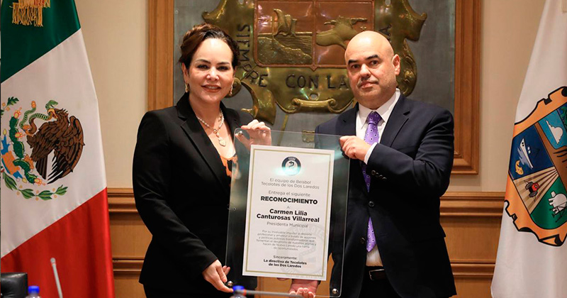 Entrega Presidente de Tecolotes de los dos Laredos, distinción a la alcaldesa Carmen Lilia Canturosas, por su apoyo al deporte profesional y amateur.