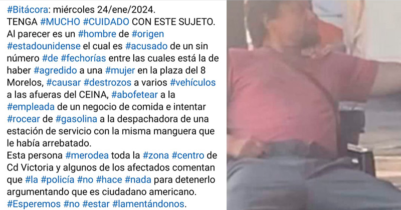 Denuncian ciudadanos y comerciantes que el sujeto agrede a personas y a causado daño a vehículos; al parecer es de origen extranjero y a la fecha, no ha sido retirado de la zona centro donde hace desmanes.