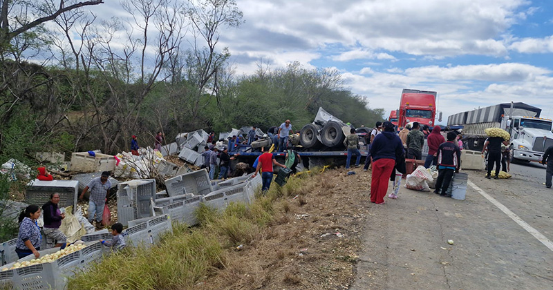 Lugareños realizan actos de rapiña en un tractocamión que volcó en la carretera a Matamoros, muy cerca de Padilla.