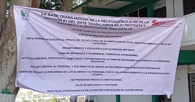 Este lunes colocaron una manta en el interior del plantel, en el que exponen las presuntas arbitrariedades, entre ellas acoso laboral, actitud prepotente, además de no presentar un proyecto institucional