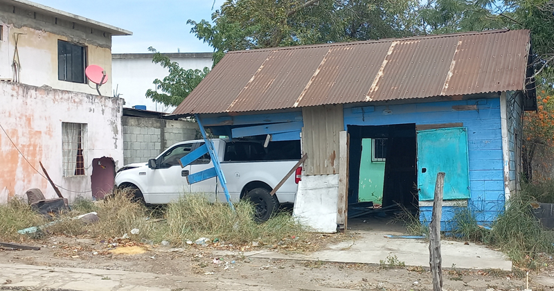 La camioneta Ford de color blanco, con placas de Tamaulipas salía de la gasolinería y en vez de frenar, la conductora se fue hacia un predio donde hay una casa de madera abandonada, la cual dañó y terminó por chocar con la pared de la vivienda.