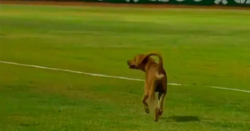 Luego del ingreso de este peculiar espontáneo, el partido se detuvo por unos minutos en lo que el cuerpo de mantenimiento del parque intentaba sacar al canino del diamante, pues ante la algarabía del público el animal se notaba desconcentrado en un inicio.