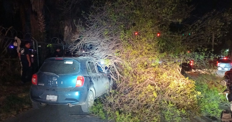 De acuerdo a las investigaciones realizadas el árbol cayó sobre un coche marca Nissan línea March, con placas de Tamaulipas, y se desplazaba de su norte por la calle 21.