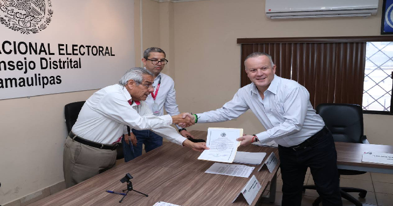 En medio de una sencilla, pero emotiva ceremonia en las instalaciones del INE en Nuevo Laredo, el ahora Diputado Federal electo, recibió su constancia de manos de Manuel Moncada Fuentes, Vocal Ejecutivo de la Junta Distrital 01 en Tamaulipas.