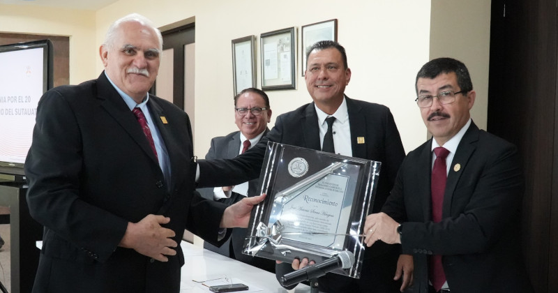 El rector Dámaso Anaya le hizo entrega de un reconocimiento al ex secretario general del SUTAUAT, Dr. José Antonio Serna Hinojosa, por la importante labor desempeñada durante su gestión, y al secretario general fundador, Gustavo Rueda Hernández.