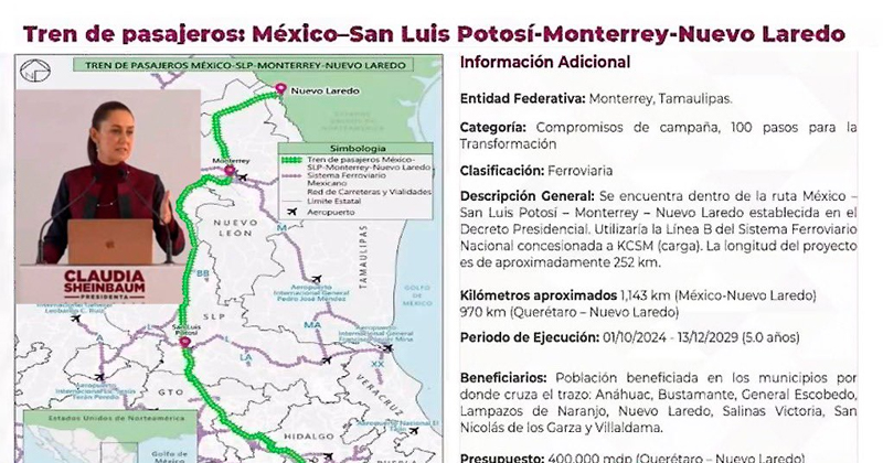 La virtual presidenta electa detalló que se encuentra dentro de la ruta México-San Luis Potosí-Monterrey-Nuevo Laredo establecida igualmente en el Decreto Presidencial, por lo que se utilizará la línea B del Sistema Ferroviario Nacional.