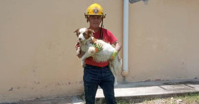 Perrita queda atorada en barda; Bomberos Voluntarios la rescatan