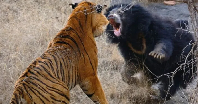 Captan el increíble momento en que un oso se defiende de ser atacado por un tigre de bengala