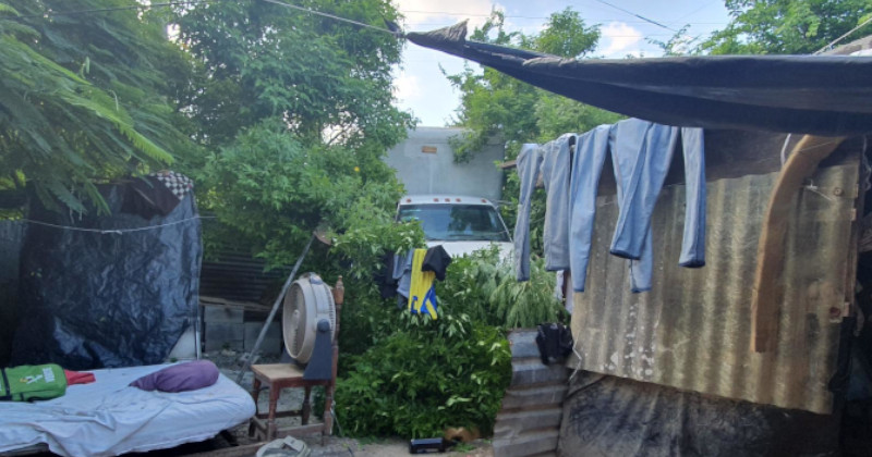 Entre los tendederos, árboles y un perro quedó una camioneta del IMSS que al no poder detenerse acabó en un patio particular.