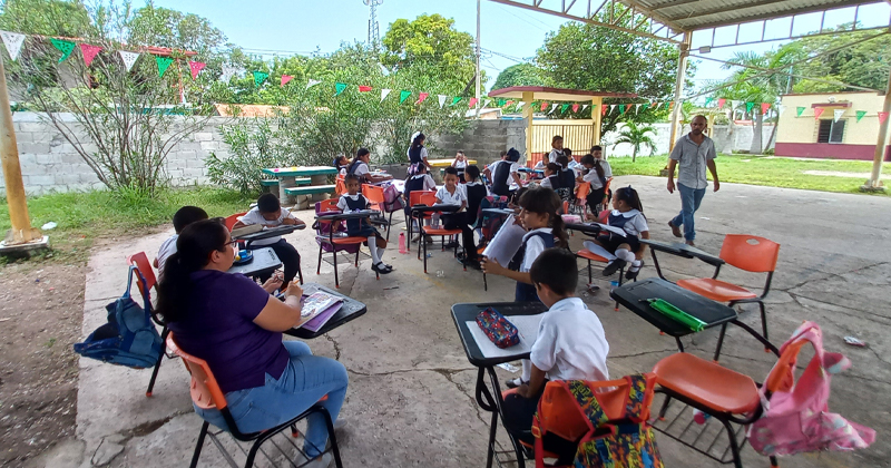 Los alumnos tienen que tomar las clases en el patio debido a que la paraestatal les cortó el suministro y no hay autoridad de la SET que les ayude a resolver el problema