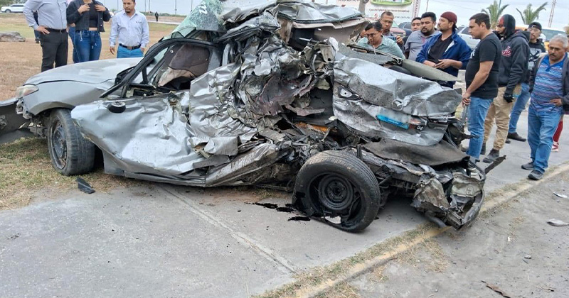 Un auto presuntamente de transporte DiDi choca contra dos tráilers en la entrada al Fraccionamiento Pirámides de Reynosa.