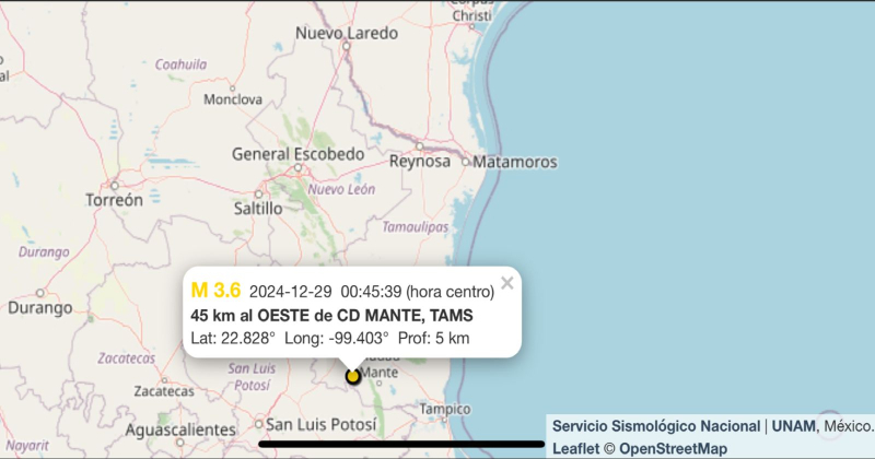 Un sismo con una magnitud preliminar se registró este domingo 29 de diciembre de 2024 a las 00:45 horas, con epicentro a 45 kilómetros al oeste de Ciudad Mante, Tamaulipas, informó el Servicio Sismológico Nacional (SSN).