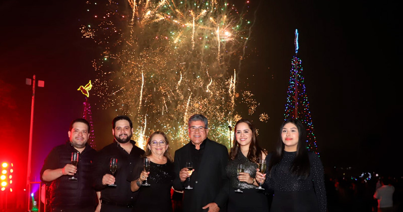 TAMPICO, TAMAULIPAS.- Con un espectáculo que quedará en la memoria de los altamirenses, el municipio dio la bienvenida al 2025 en un evento encabezado por el alcalde, Dr. Armando Martínez Manríquez, acompañado de su esposa, la presidenta del DIF Altamira, C.P. Rossy Luque de Martínez, y familia. La celebración tuvo como escenario principal la Isla de la Esperanza, con el puente flotante iluminado y un impresionante show de fuegos artificiales musicalizados.