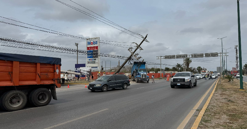 Camión de volteo daña dos postes y deja sin energía a comercios