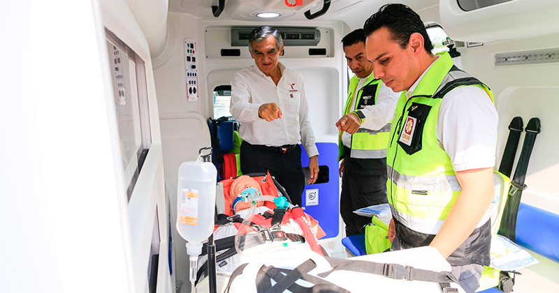 El gobernador entregó las unidades equipadas para mejorar la capacidad operativa del Centro Regulador de Urgencias Médicas; destacó avances en salud, como el incremento en el abasto de medicamentos y la modernización de hospitales.