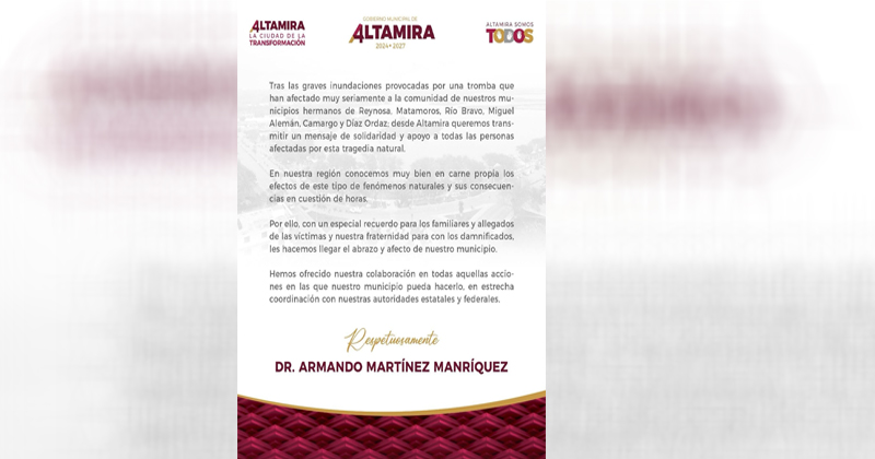 Ante las inundaciones en Reynosa el alcalde de Altamira, Dr Armando Martínez Manríquez expresó su solidaridad con todas las familias perjudicadas