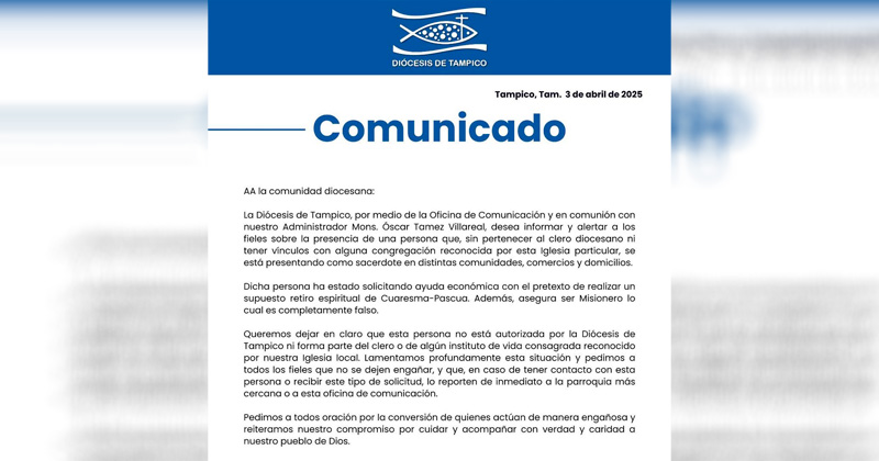 “La Diócesis de Tampico, por medio de la Oficina de Comunicación y en comunión con nuestro Administrador Mons. Óscar Tamez Villareal, desea informar y alertar a los fieles sobre la presencia de una persona que, sin pertenecer al clero diocesano ni tener vínculos con alguna congregación reconocida por esta Iglesia particular, se está presentando como sacerdote en distintas comunidades, comercios y domicilios”, señala el comunicado.