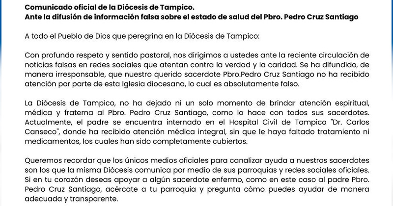 La Diócesis de Tampico, aseguró que en ningún momento ha dejado de brindar atención espiritual, médica y fraterna al Pbro. Pedro Cruz Santiago.