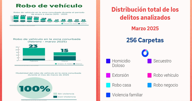 De acuerdo a información del observatorio Ciudadano, las tres ciudades conurbada registran una disminución por debajo de la media nacional en 6 de 7 delitos .Sin embargo Violencia familiar y robo de vehículos muestran tendencias al alza y se mantienen como focos rojos en la región