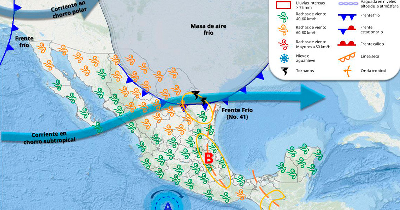 El frente frío 41 traerá lluvias, descenso de temperatura, vientos fuertes y riesgo de granizo, torbellinos o tornados en el norte de Tamaulipas; Protección Civil pide extremar precauciones.