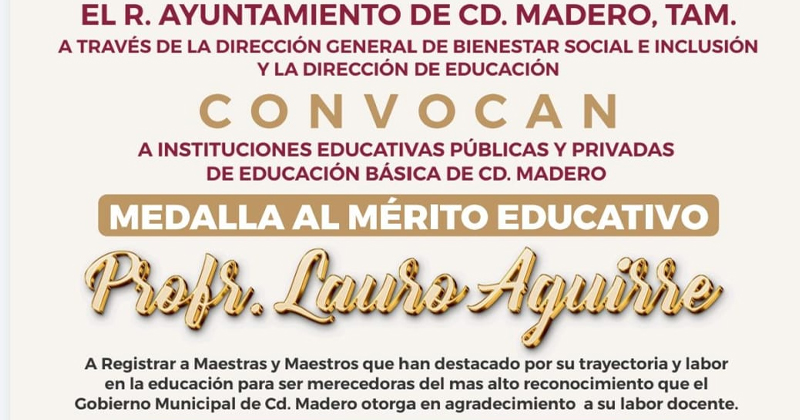 Convocan a la entrega de medalla al mérito educativo “Profr. Lauro Aguirre”