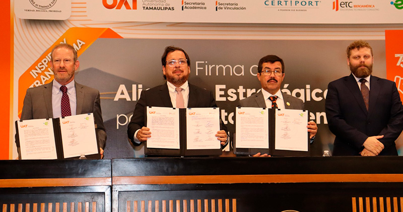 El rector de la Universidad Autónoma de Tamaulipas (UAT), Dámaso Anaya Alvarado, presidió la firma de alianzas estratégicas con organismos internacionales especializados en certificación y desarrollo académico.