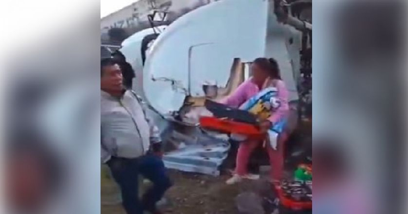 VIDEO: Mujer va la a rapiña de tráiler volcado con un bebé en brazos
