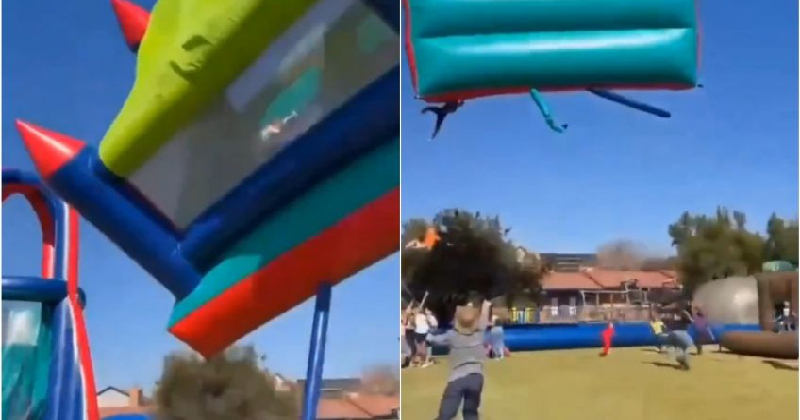 KRUGERSDORP, SUDÁFRICA.- Dos niños resultaron lesionados cuando un castillo inflable en el que brincaban salió volando, debido a una ráfaga de viento que levantó el juego durante un festejo escolar en la ciudad de Krugersdorp, en Sudáfrica. El hecho quedó grabado en video y comenzó a circular en redes sociales, en donde se volvió viral.