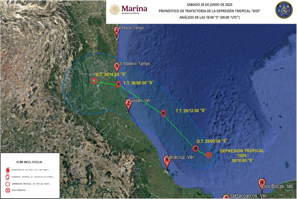 La zona de inestabilidad se localiza a 153 kilómetros al este del puerto de Veracruz y continúa su desplazamiento hacia el noroeste a 11 km/h.