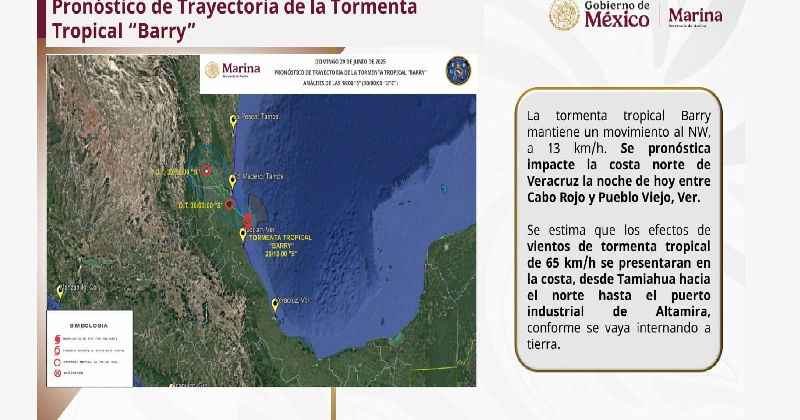 TAMAULIPAS, MÉXICO.- La Tormenta Tropical “Barry” impactará la noche de este domingo entre Cabo Rojo y Pueblo Viejo, Veracruz, según el último informe emitido por la Secretaría de Marina a las 18:00 horas.
