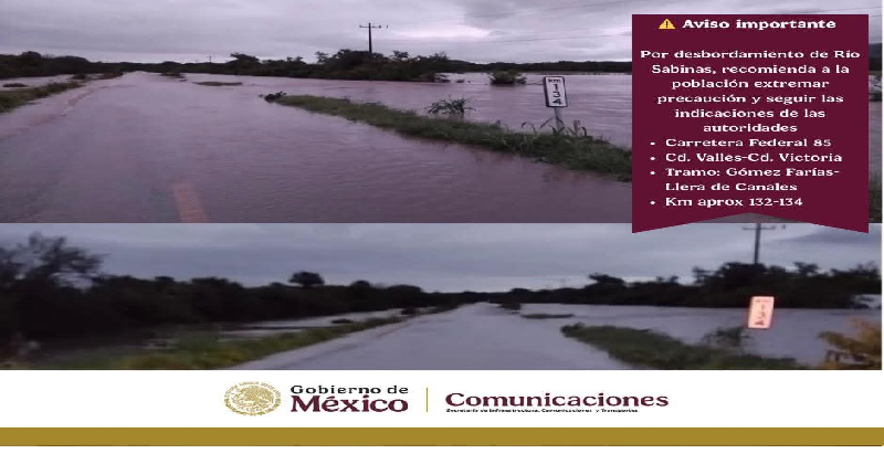 Además, por el desbordamiento del Río Sabinas, se recomienda extremar precauciones en la Carretera Federal 85, en el tramo Gómez Farías–Llera de Canales, entre los kilómetros 132 y 134, sobre la vía Cd. Valles–Cd. Victoria.