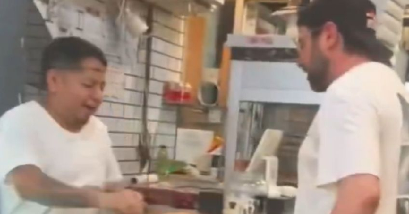 VIDEO: Empleado de pizzería golpea con una rebanada en la cara a un cliente que lo insultó