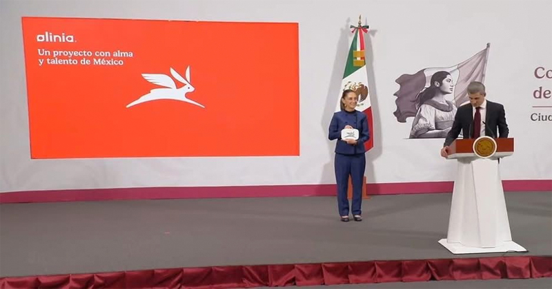 Presenta el emblema del auto eléctrico OLINIA, “Liebre Alebrije”, durante la conferencia mañanera de Claudia Sheinbuam.