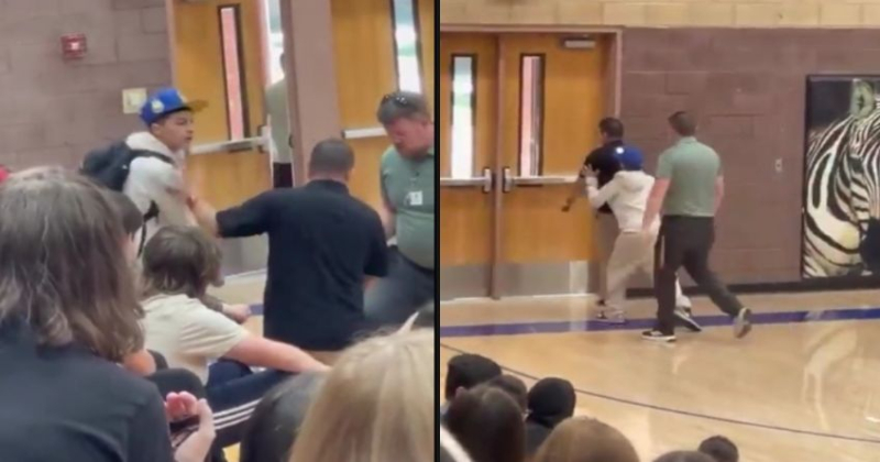 Pese a la insistencia del joven, el docente se alejó de la escena e incluso salió por las puertas del gimnasio, mientras todo el alumnado fue testigo del confrontamiento. Sin embargo, fue en aquel momento que un guardia de seguridad intervino y sujetó al joven por la espalda para azotarlo brutalmente contra el piso, por medio de una llave de lucha libre denominada «suplex».
