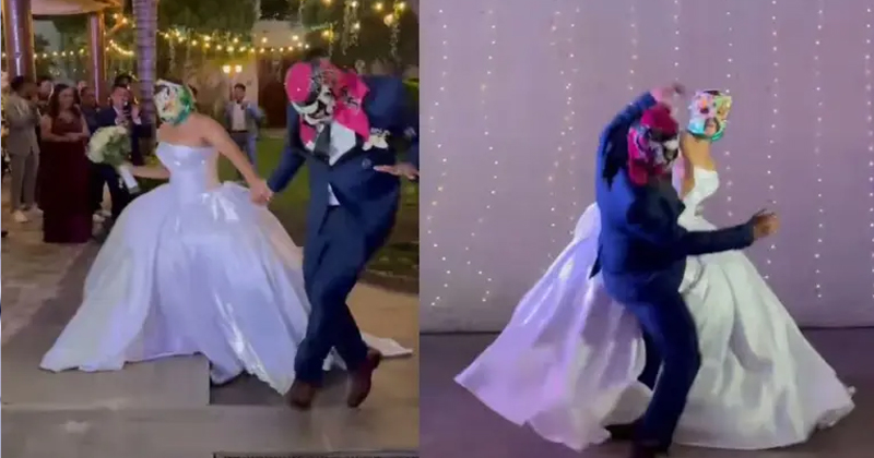 Una pareja sorprendió en su boda al reemplazar el tradicional primer baile por una entrada estilo lucha libre, ganándose aplausos en redes y entre sus invitados.