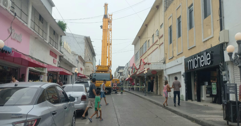 Cierran calle en el centro por maniobras de pesada grúa
