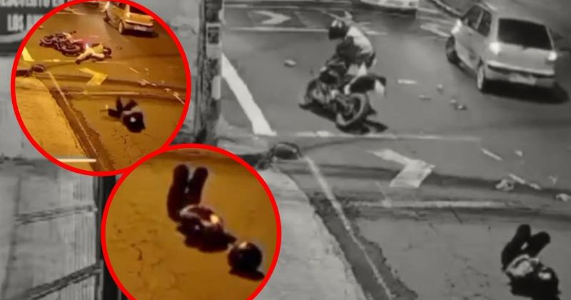 Las imágenes captadas por las cámaras de seguridad de un negocio en Sangolqui, Ecuador, muestran el instante en el que la motocicleta se impacta contra la parte trasera del vehículo, éste último quedó atravesado a media calle por la velocidad que cada unidad llevaba en el momento del accidente.