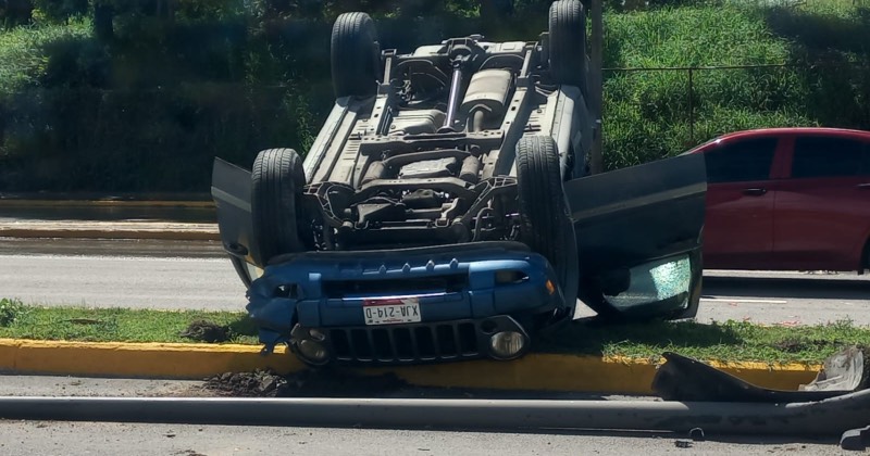 Camioneta choca, derriba poste y palmera y luego vuelca