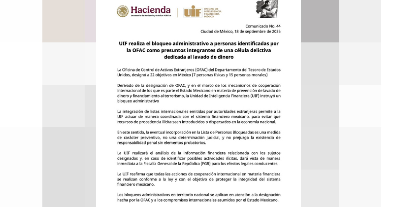 UIF bloquea a 22 objetivos en México tras designación de la OFAC por presunto lavado de dinero