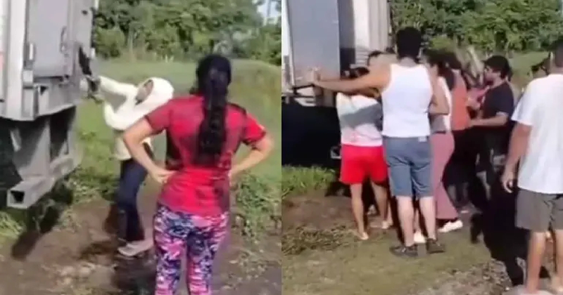 VIDEO: Pobladores saquean camión que sufrió una ponchadura mientras el chofer intentaba cambiar la llanta