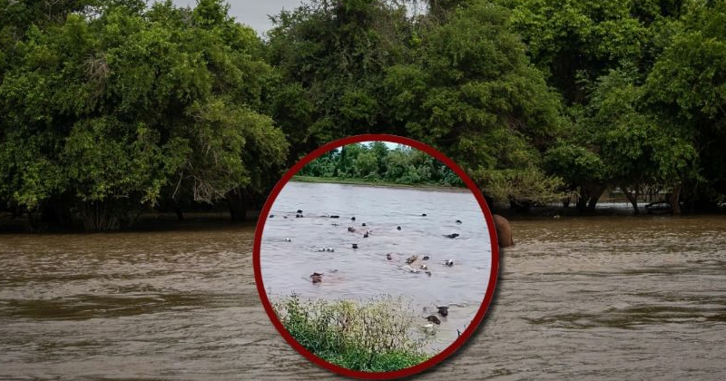 En los videos compartidos en plataformas como X y Facebook se puede ver cómo algunos animales intentan acercarse a las orillas, pero la mayoría termina siendo arrastrada por la corriente.