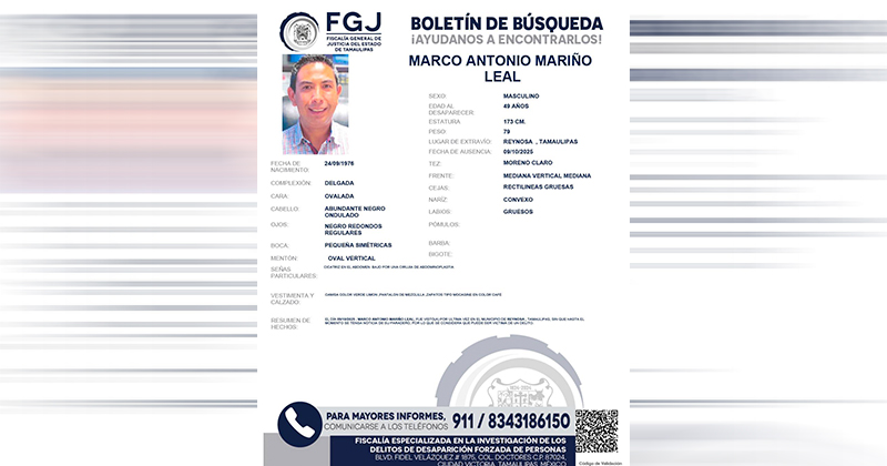 La FGJ mantiene la búsqueda del empresario Marco Antonio Mariño Leal, desaparecido el 9 de octubre en Reynosa