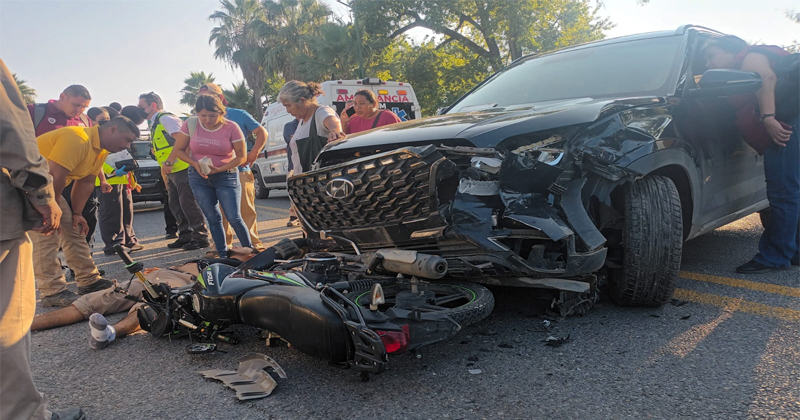 Camioneta lujosa impacta a motociclista al salir del camellón, y por sus lesiones fue necesario ingresarlo a un centro médico