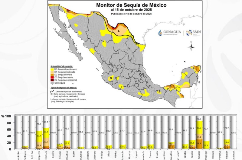 Pese a las lluvias registradas en gran parte del país, el norte de Tamaulipas continúa con una sequía meteorológica anormal. Un 23.3 % del territorio estatal permanece “anormalmente seco”, afectando el abasto de agua, la producción agrícola y ganadera.