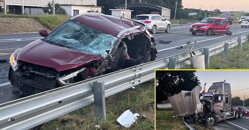 Conductor de un auto compacto trata de dar la vuelva U, lo que provoca que sea embestido por un tráiler que se proyecta contra una camioneta.