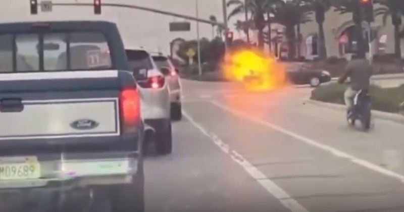 VIDEO: Motociclista se incendia tras omitir semáforo en rojo y chocar contra un coche