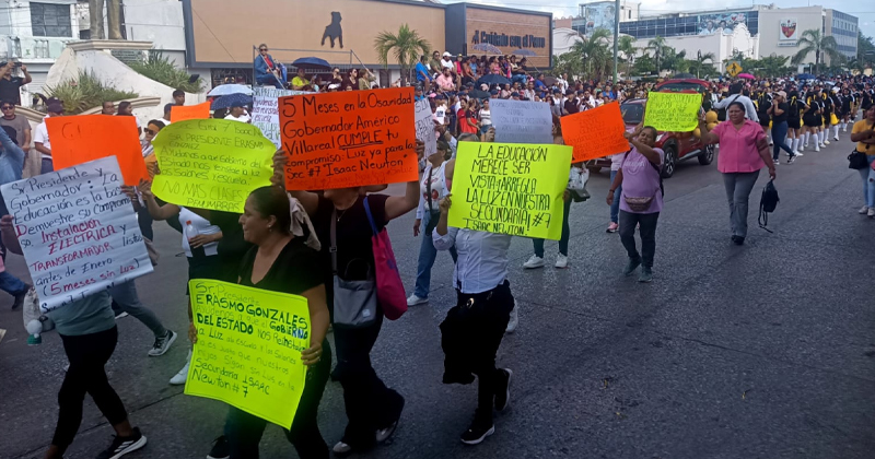 CIUDAD MADERO, TAM.- Madres y padres de la Escuela Secundaria No. 7 “Isaac Newton” aprovecharon el desfile para manifestarse de forma pacífica y exigir una solución inmediata a un problema que arrastran desde hace cinco meses: la falta de energía eléctrica en el plantel.