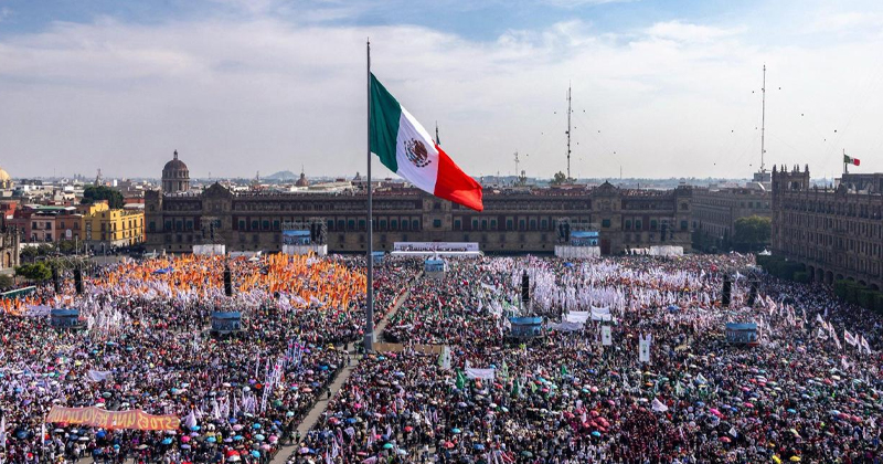 Sheinbaum centró su discurso en defender los avances de la 4T, habló de salarios, reservas históricas y reducción de homicidios, y denunció campañas sucias y uso de bots, mientras la plaza respondía con consignas de apoyo que reforzaron el cierre de filas.