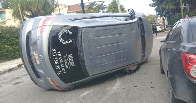 TAMPICO, TAMAULIPAS.- Una carroza que aparentemente se desplazaba a gran velocidad, chocó con un vehículo que estaba estacionado para luego volcarse, en la colonia Flores en Tampico.