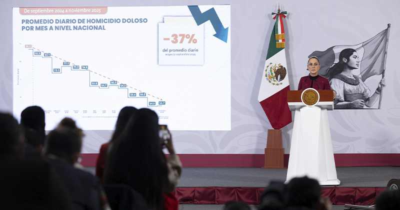 El promedio de homicidios dolosos se redujo de 86.9 víctimas diarias en septiembre 2024 a 54.7 en noviembre 2025, lo que representa 32 homicidios diarios menos.